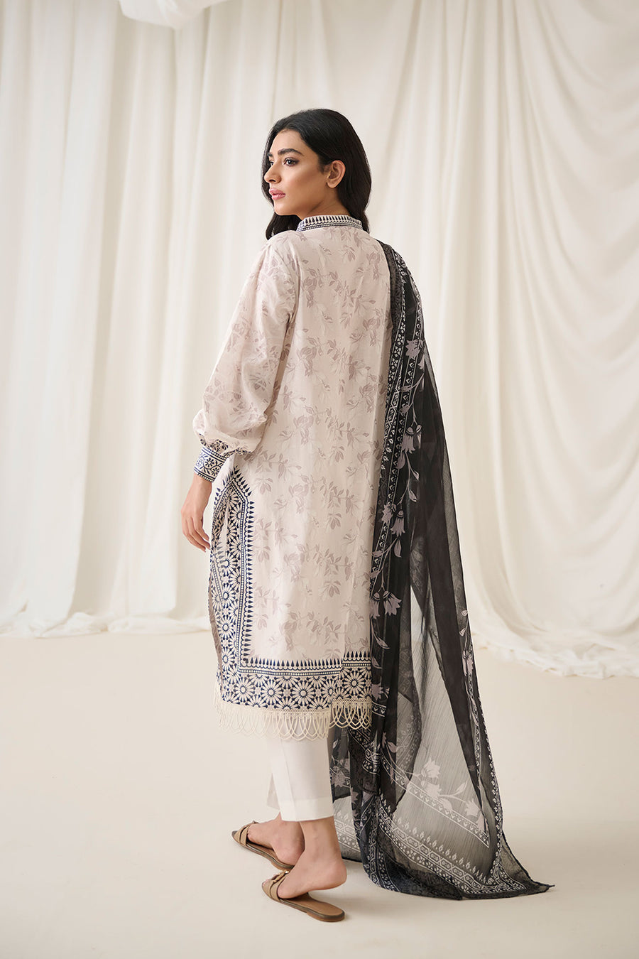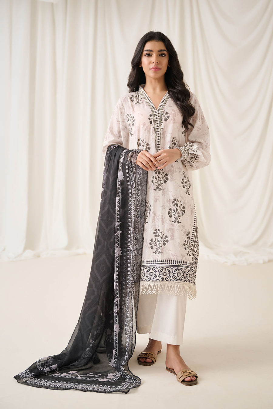 Dhanak DU-3164 Off white Printed Lawn - 3pcs Monochrome Collection Original brand suit fabric and photography lite diffrance in actual print.