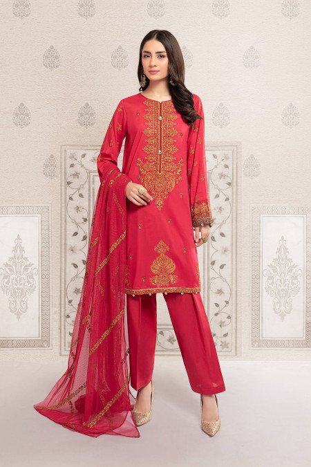 Maria B Red DW-EF22-32 Luxe Prets 2022 Original brand suit fabric and photography lite diffrance in actual print.