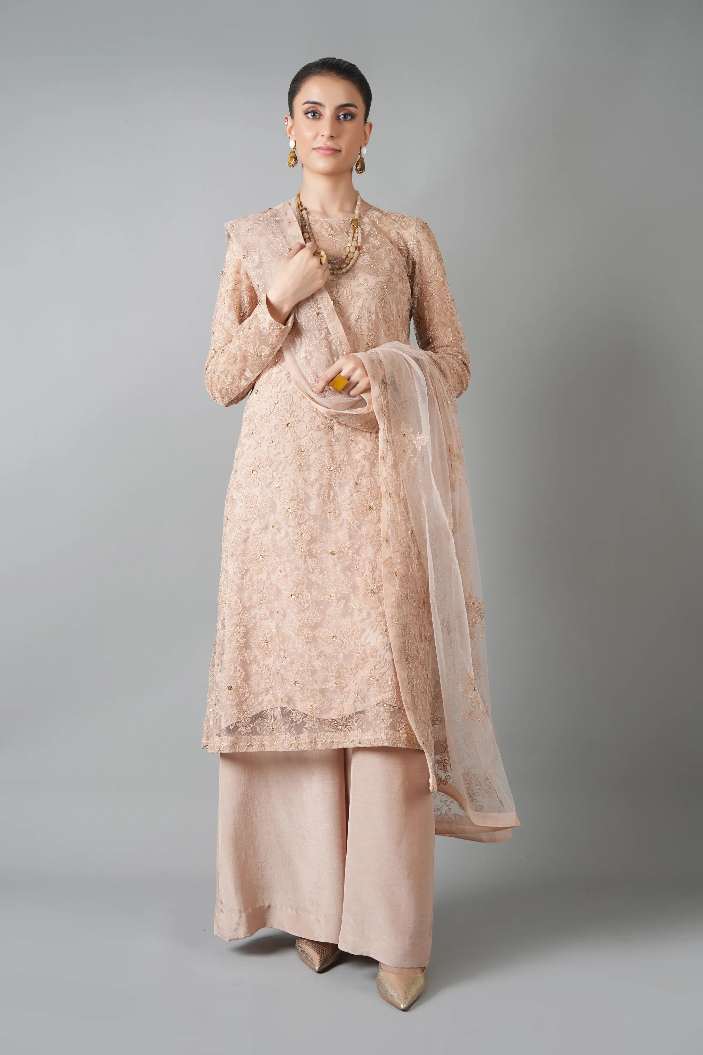 The Classic Victorian-02-Biege Chiffon Unstitched features a captivating blend of traditional and contemporary elements. The intricate embroidery, meticulously executed with delicate threads, adds a touch of sophistication to the design. The vibrant colors and patterns used in the embroidery create a visually stunning effect, making the ensemble perfect for special occasions. The silhouette of the Classic Victorian-02-Biege is both flattering and comfortable, ensuring that the wearer feels confident and graceful. The Chiffon fabric, known for its breathability and softness, provides a luxurious feel against the skin, making it ideal for the warmer months.