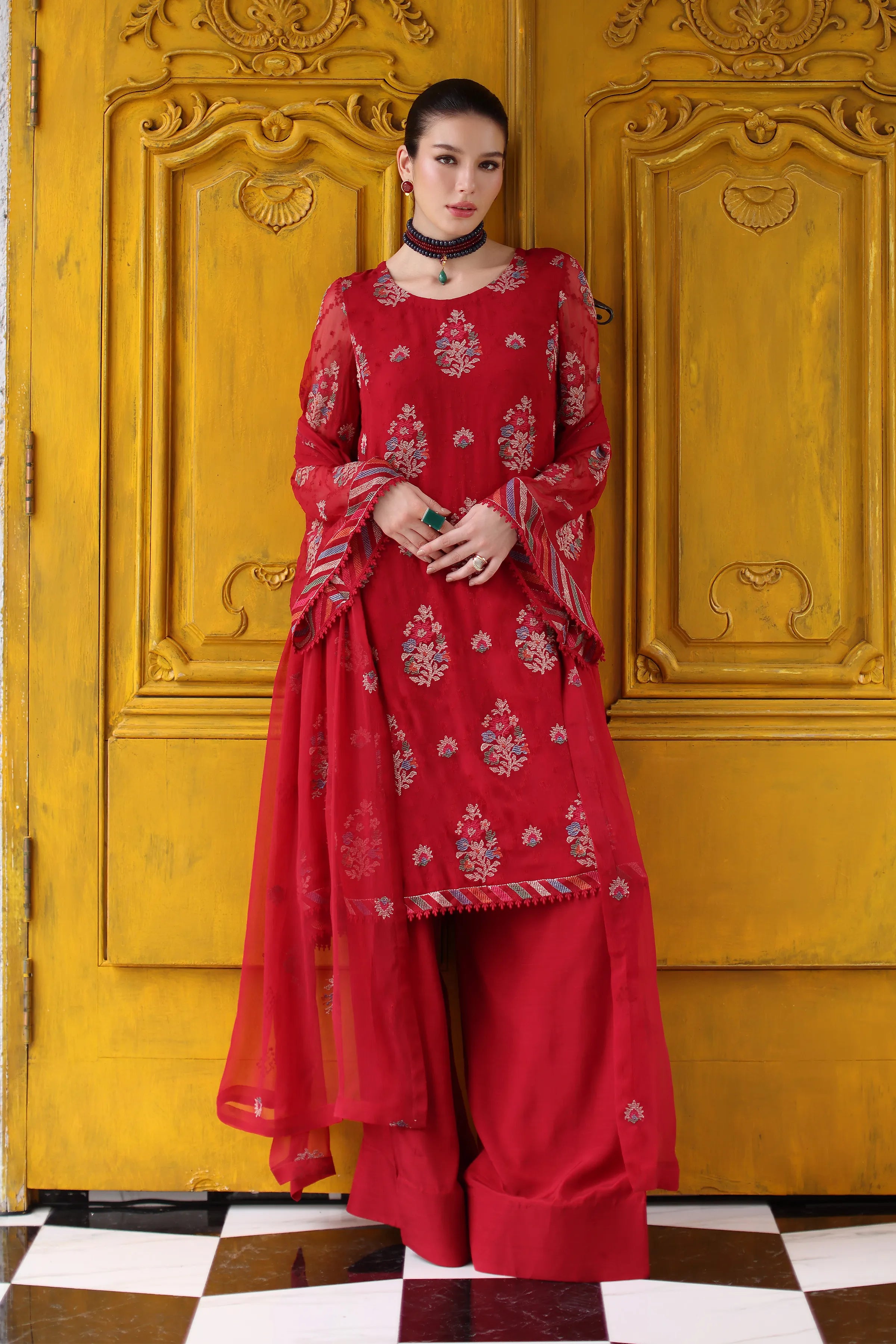 The Shimmer Glimmer-01 Red Chiffon Unstitched features a captivating blend of traditional and contemporary elements. The intricate embroidery, meticulously executed with delicate threads, adds a touch of sophistication to the design. The vibrant colors and patterns used in the embroidery create a visually stunning effect, making the ensemble perfect for special occasions. The silhouette of the Shimmer Glimmer-01 Red is both flattering and comfortable, ensuring that the wearer feels confident and graceful. The Chiffon fabric, known for its breathability and softness, provides a luxurious feel against the skin, making it ideal for the warmer months.