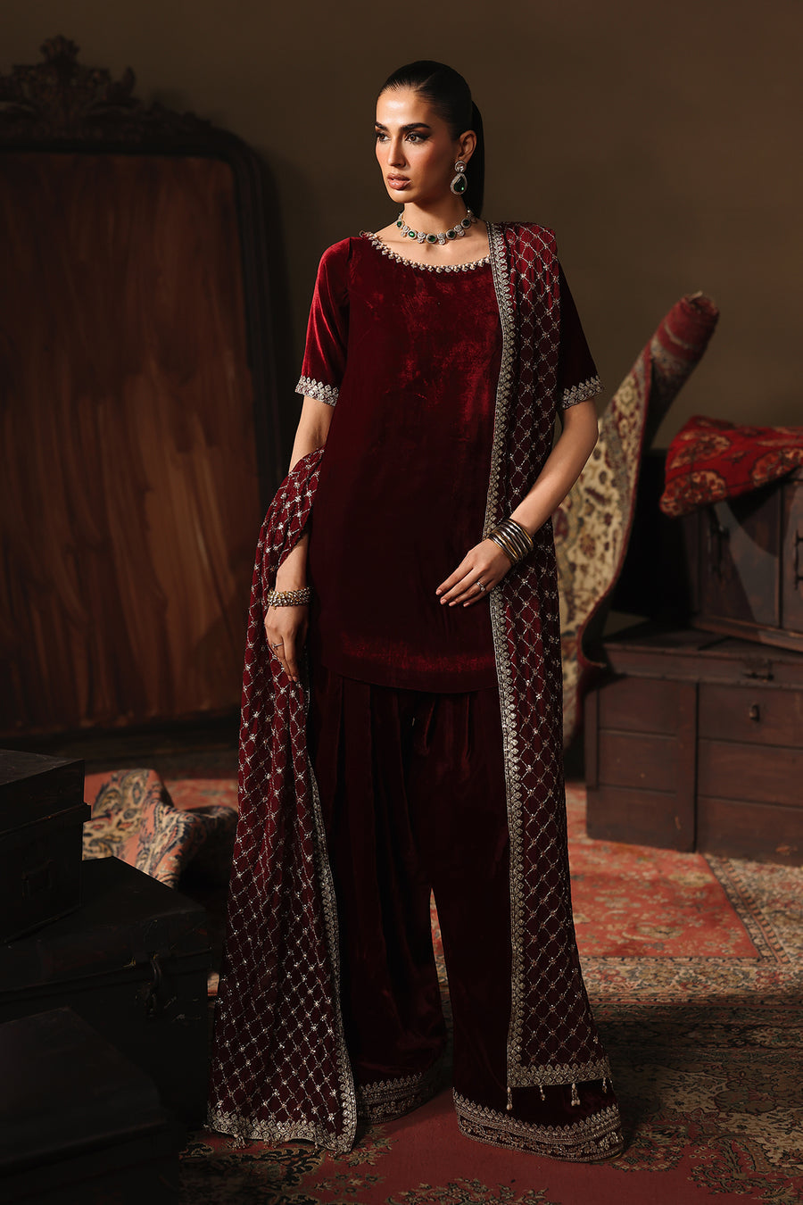 Charizma a renowned Pakistani fashion brand, has consistently captivated the hearts of fashion enthusiasts with its exquisite designs and impeccable craftsmanship. One such masterpiece that has garnered immense admiration is the VVT-5-02 Velvet Stitched. This elegant ensemble, crafted from premium quality Velvet fabric is a testament to Charizma commitment to timeless style and comfort.