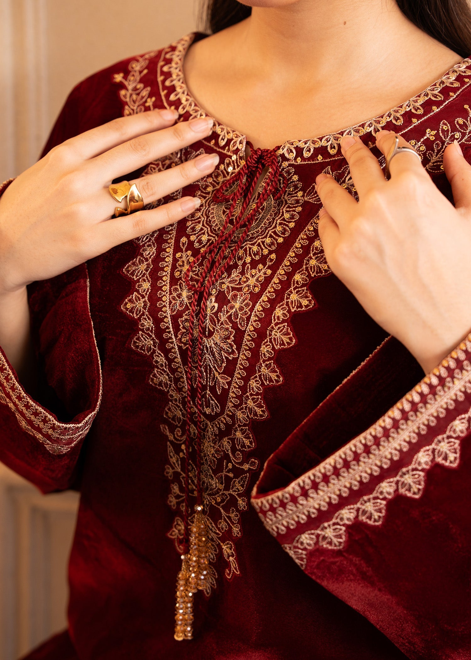 Fozia Khalid Crimson Grace Velvet Sttched is typically part of the brand's The Velvet Edit, a highly anticipated annual release that showcases the latest trends and designs. The The Velvet Edit is renowned for its festive and vibrant aesthetic, and the Crimson Grace embodies this spirit perfectly.