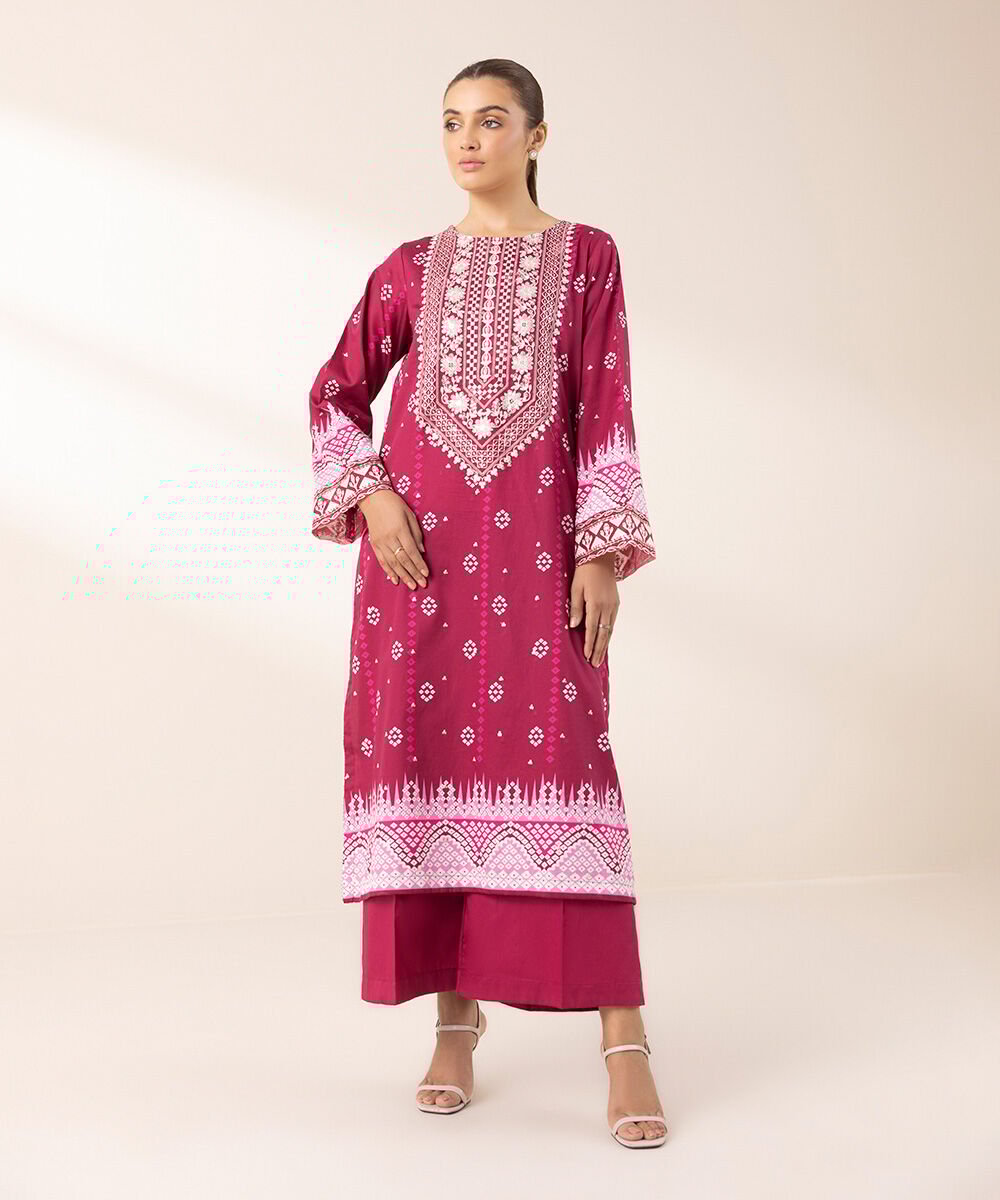 The Embroidered Cotton Satin Shirt 3PEDF25V314S Lehengas Pakistani Clothes features a captivating blend of traditional and contemporary elements. The intricate embroidery, meticulously executed with delicate threads, adds a touch of sophistication to the design. The vibrant colors and patterns used in the embroidery create a visually stunning effect, making the ensemble perfect for special occasions. The silhouette of the Embroidered Cotton Satin Shirt 3PEDF25V314S is both flattering and comfortable, ensuring that the wearer feels confident and graceful. The Lehengas fabric, known for its breathability and softness, provides a luxurious feel against the skin, making it ideal for the warmer months.
